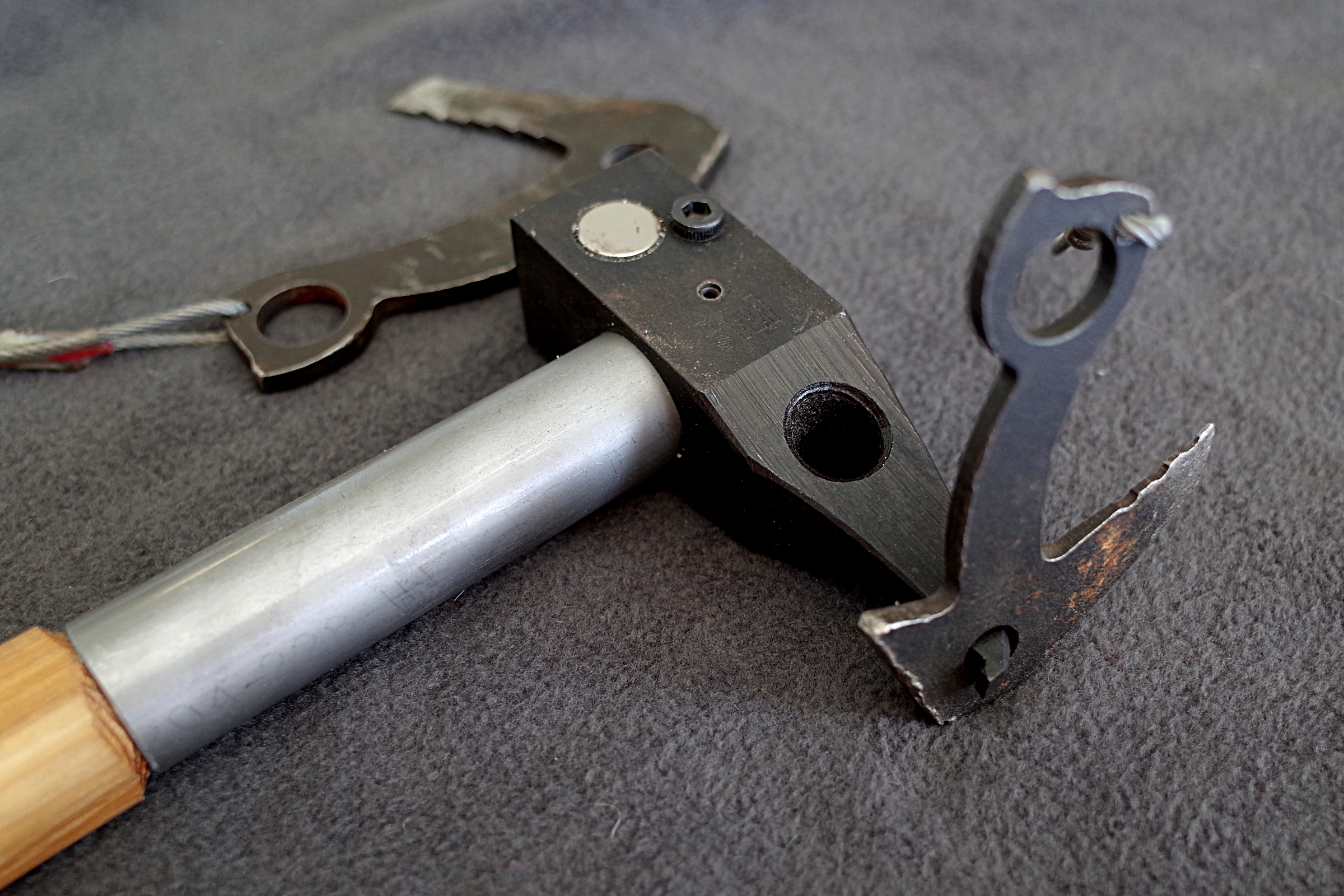 1) 15mm x 3mm neodymium magnets are set into each cheek of the hammer with epoxy. These are intended to reach and set gear. Primarily beaks such as BD Peckers, Moses Tomahawks and the like. A daisy or daisy/aider is attached to the beak before reaching, and that webbing is held with the same hand holding the hammer handle. Stick the piece to the magnet, reach up and insert, pull the hammer down to release and then hammer it in.