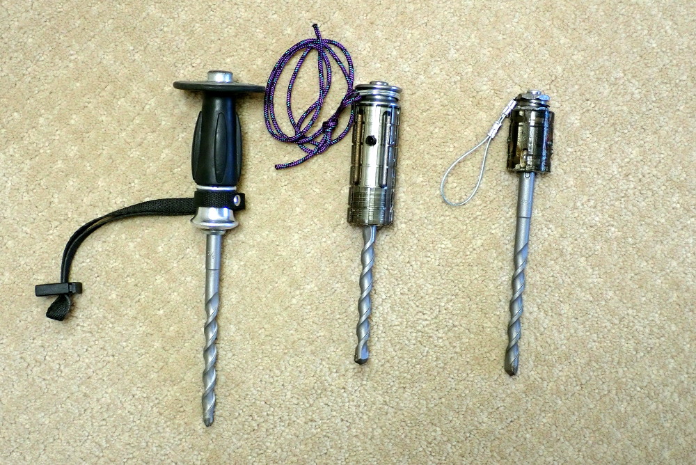 of 3/8" boltsThat said, hand drilling is hard, tiring and often frustrating work. With a poor stance and hard rock, it can easily take a half hour to hand drill and place a bolt. Also, many drill holders are annoying to use and inefficient. Some drill holders have set screws that need to be constantly tightened. Some drill holders require two tools (two wrenches or a hammer and a wrench) to change bits. Some are heavy or large. I've heard that some pinch your hand. I decided to try to make a better drill holder.